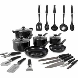 Fully equip yourself with all of the bare essentials in your kitchen using the Equip 6 Piece Pan Set with 14 Piece Tool Set. Comprising 16, 18 and 20cm saucepans, 20 and 26cm fry pans as well as a 24cm casserole pan and a 14 Piece Tool Set, you can now create a whole host of delicious dishes without hassle. Built to stand the test if time, each pan is crafted from high quality 2.5mm pressed aluminium. A ceramic non-stick inner coating requires little to no oil, meaning you can now create a healthier alternative to family favourites whilst a heat resistant exterior ensures safety during use. The pans are suitable for all hob types excluding induction. The included 14 Piece Tool Set comprises a slotted spoon, solid spoon, slotted turner, skimmer, ladle, peeler, grater, pizza cutter, can opener as well as a 5 piece knife set including a chef, bread, slicer, utility and paring knife. Each item requires only a simple hand wash to maintain its optimum performance.